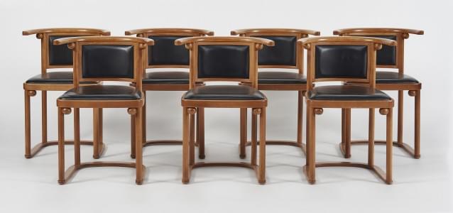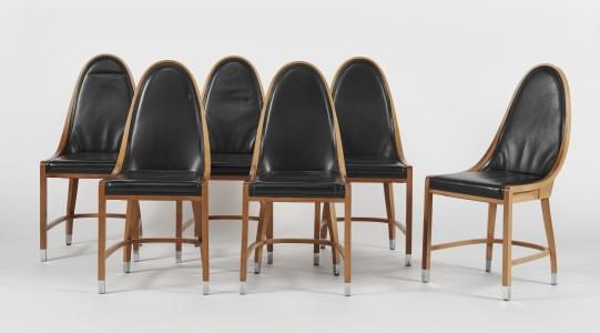 Suite de sept chaises modèle Fledermaus, bois au naturel et cuir