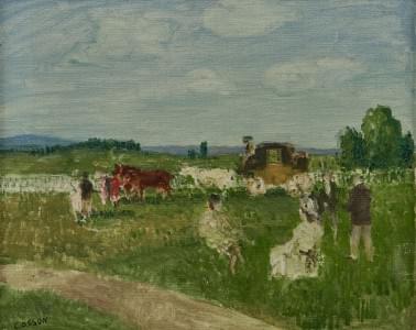 L'arrivée à la garden party, huile sur toile, signée, 50x60 cm