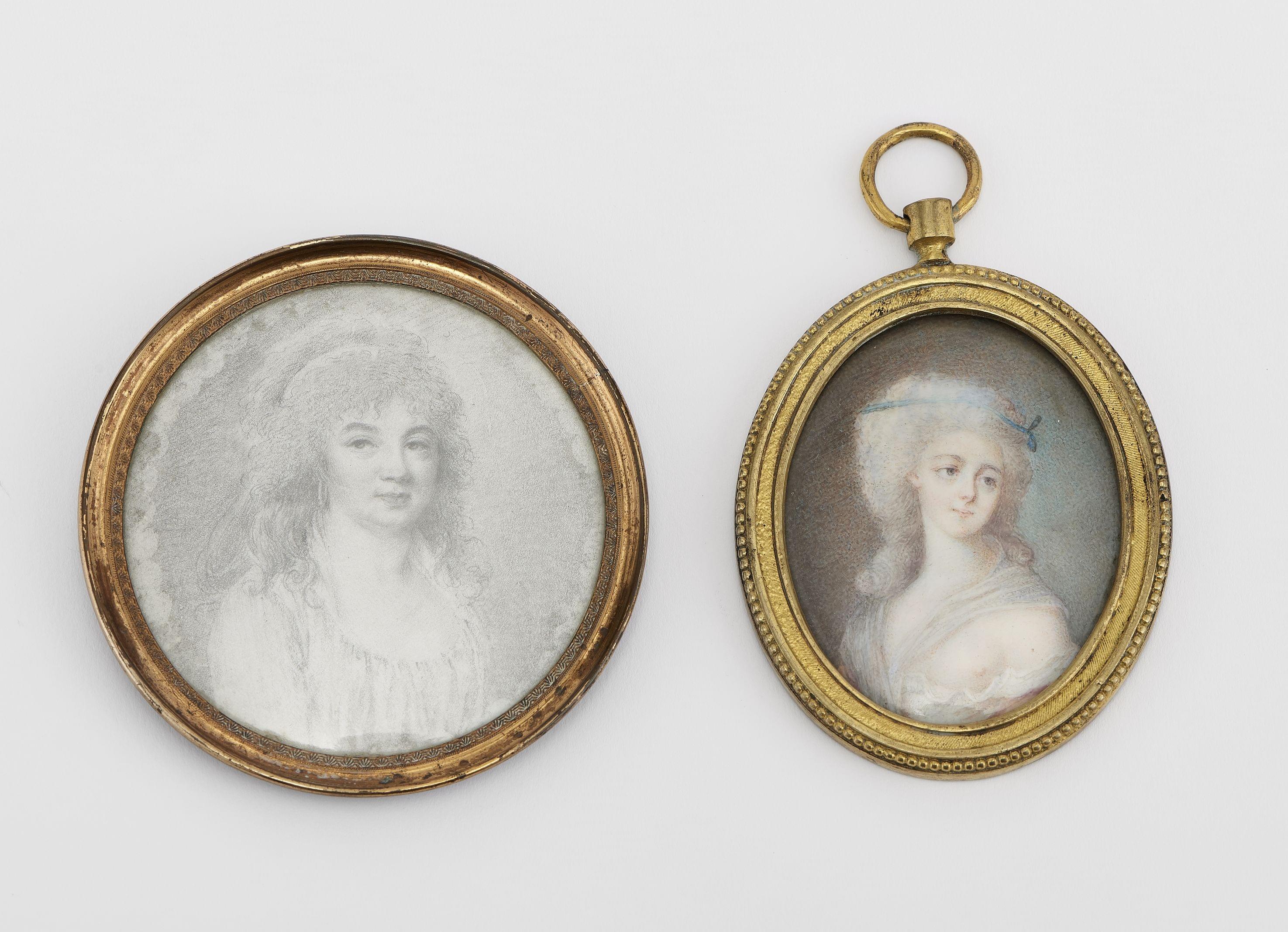 414. Tabatière ronde ornée d'une miniature représentant une jeune fem...