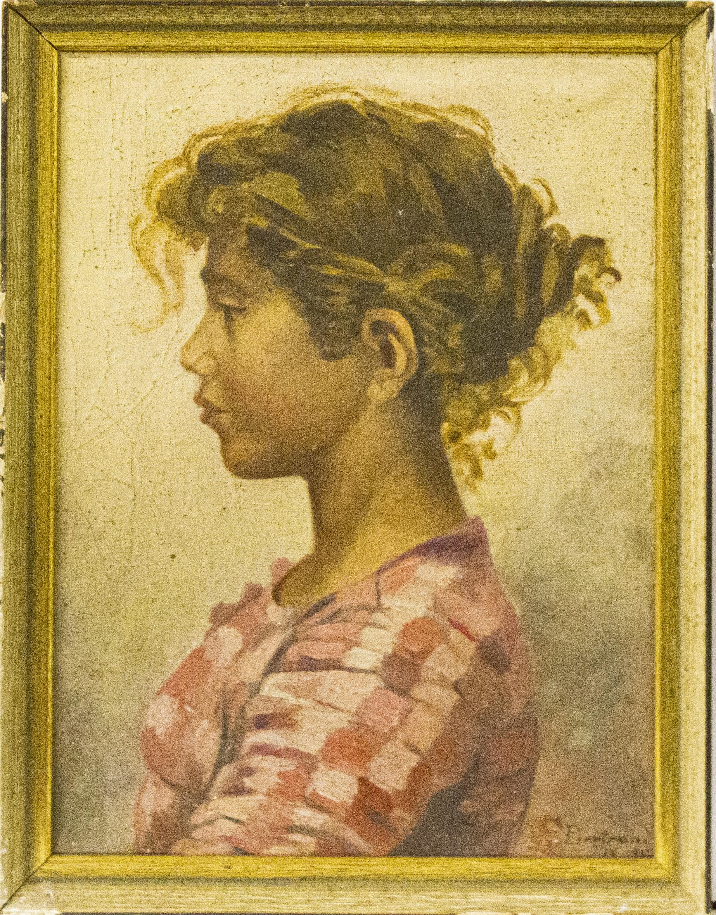 3490. Porte-monnaie en nacre orné d'une miniature de jeune fille porta...