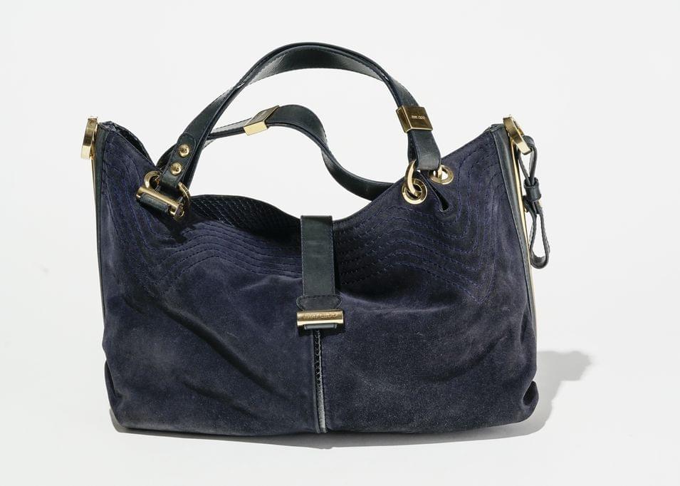 Daim bleu nuit, python et cuir, garniture en métal doré, double anse, 30x40x16 cm