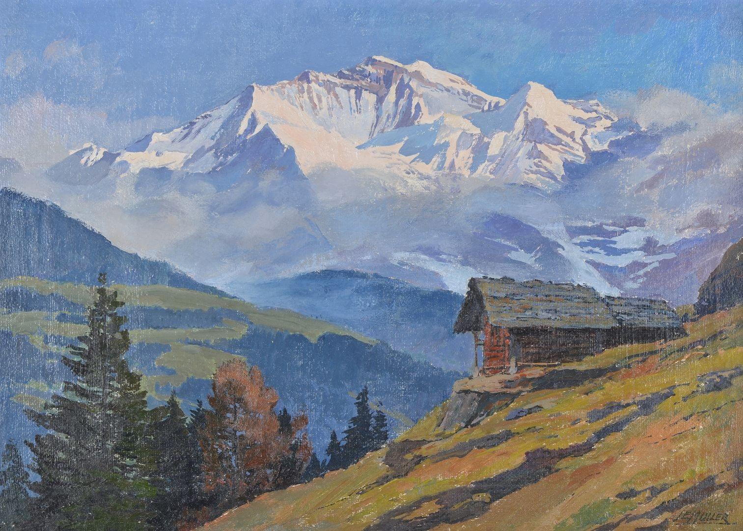 Vue du lac avec les Dents du midi, huile sur toile, monogrammée...