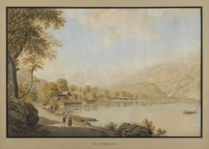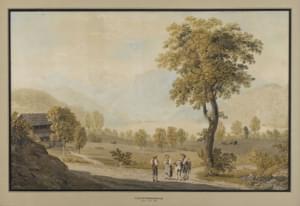 Paire de lavis: vue de lac et montagne et paysans et vache, l'un signé et daté 1813, 44x65 cm