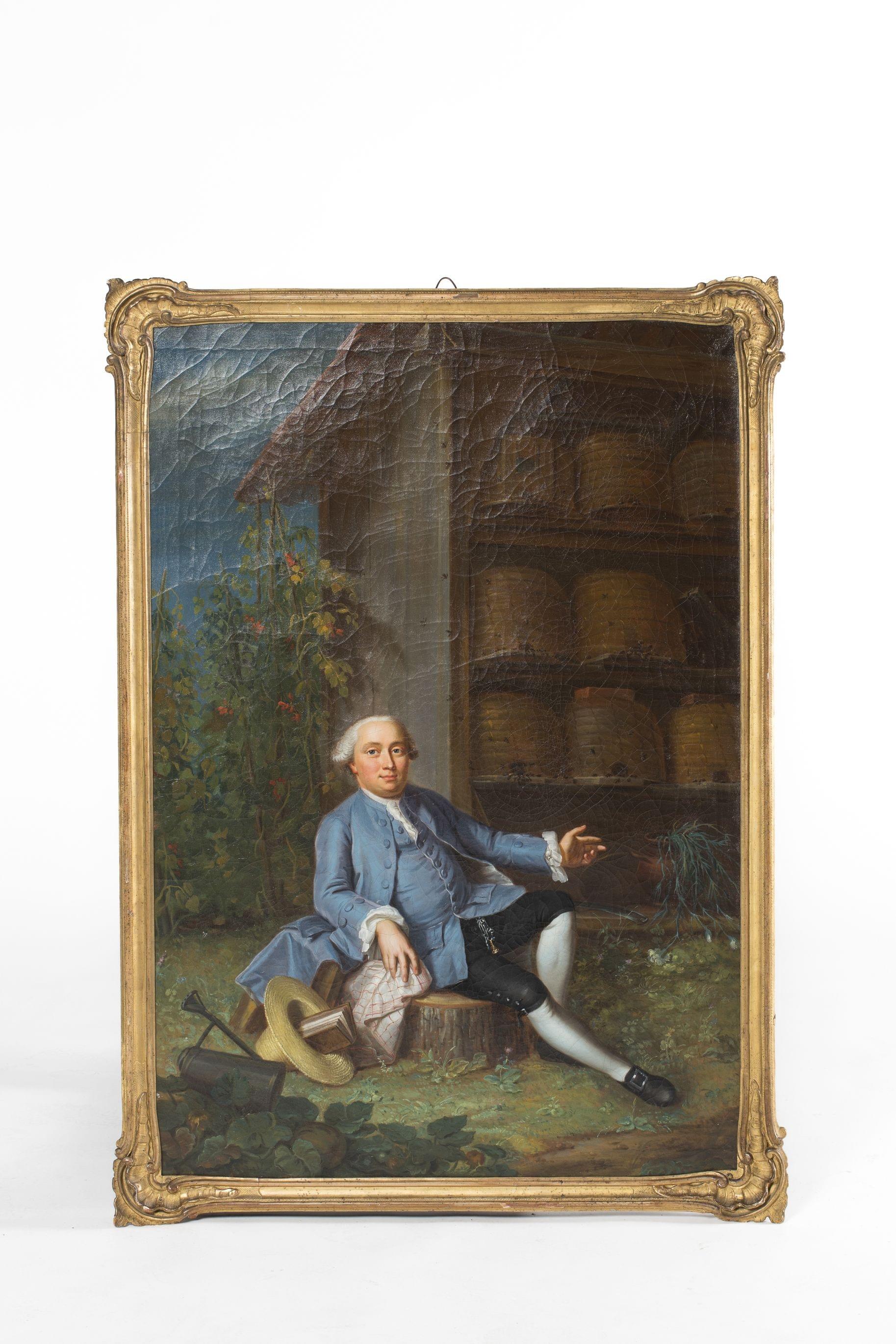 Portrait de Friching d'Uttige [Vincent Frisching (1727-1790) âgé de 34 ans, en apiculteur. Signé et daté 1761 au verso, huile sur toile, 102x70 cm. Ref: Berns goldene Zeit (2008); Essen und Trinken im alten Bern (1984); Th. Freivogel, Emanuel Handmann (1718-1781), 2002