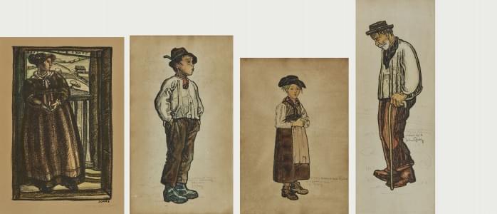 Personnages valaisans, quatre gravures dédicacées et monogrammées à la mine de plomb, de 45x31 à 57x37 cm