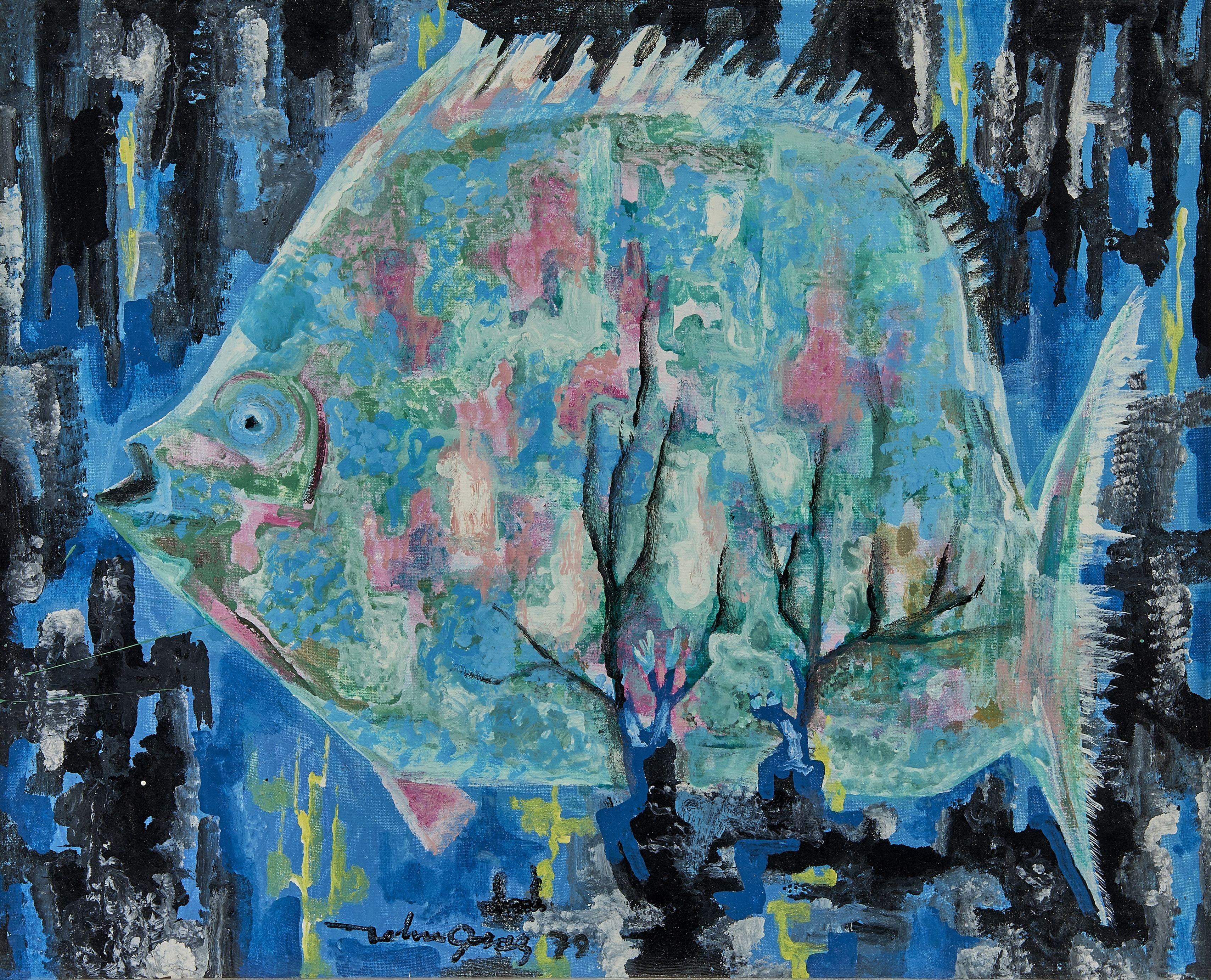 Poisson, huile sur toile, signée et datée 79, 50x60 cm