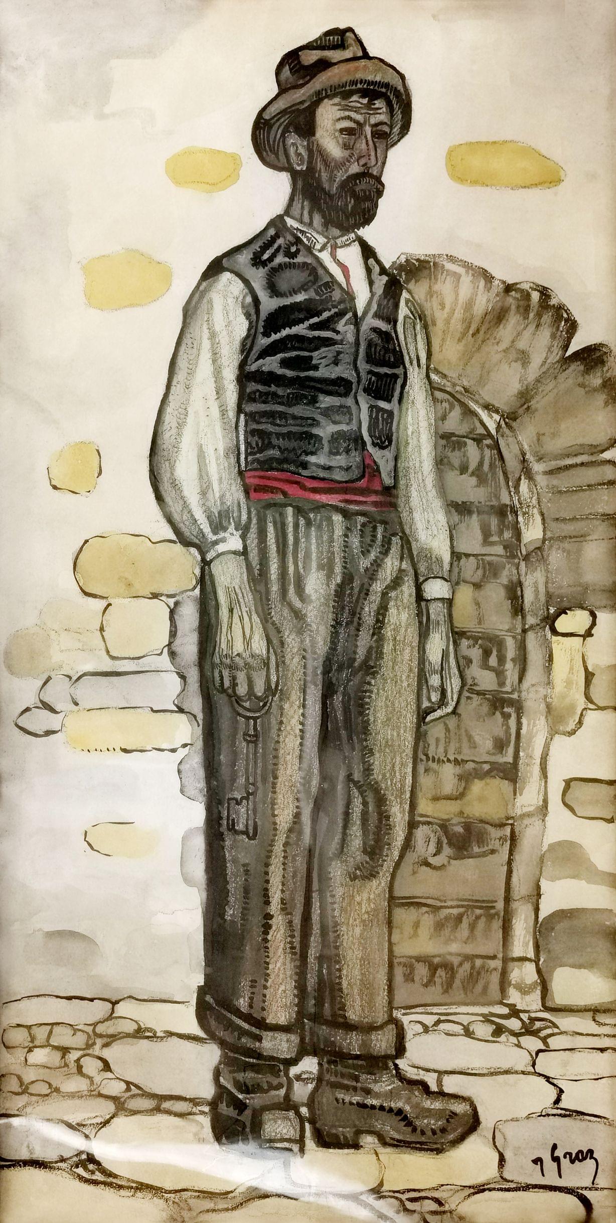 Homme barbu tenant une clef, aquarelle, crayon et encre sur papier, signé, 56x29 cm