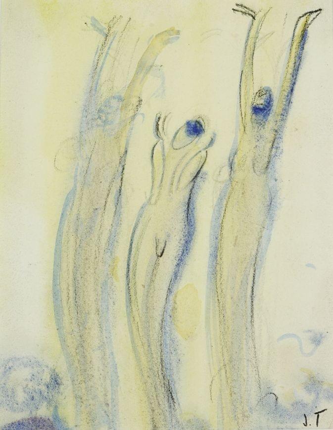 Figures jaunes sur fond bleu, aquarelle sur papier, monogrammée,...