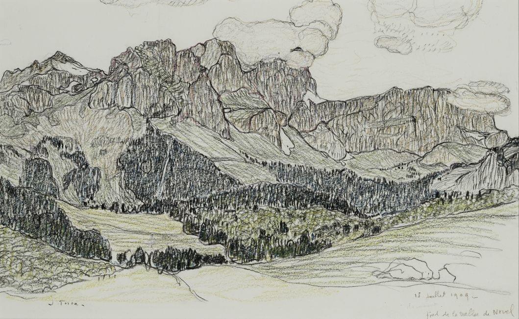 Col montagneux, crayons de couleurs sur papier, monogrammé et da...