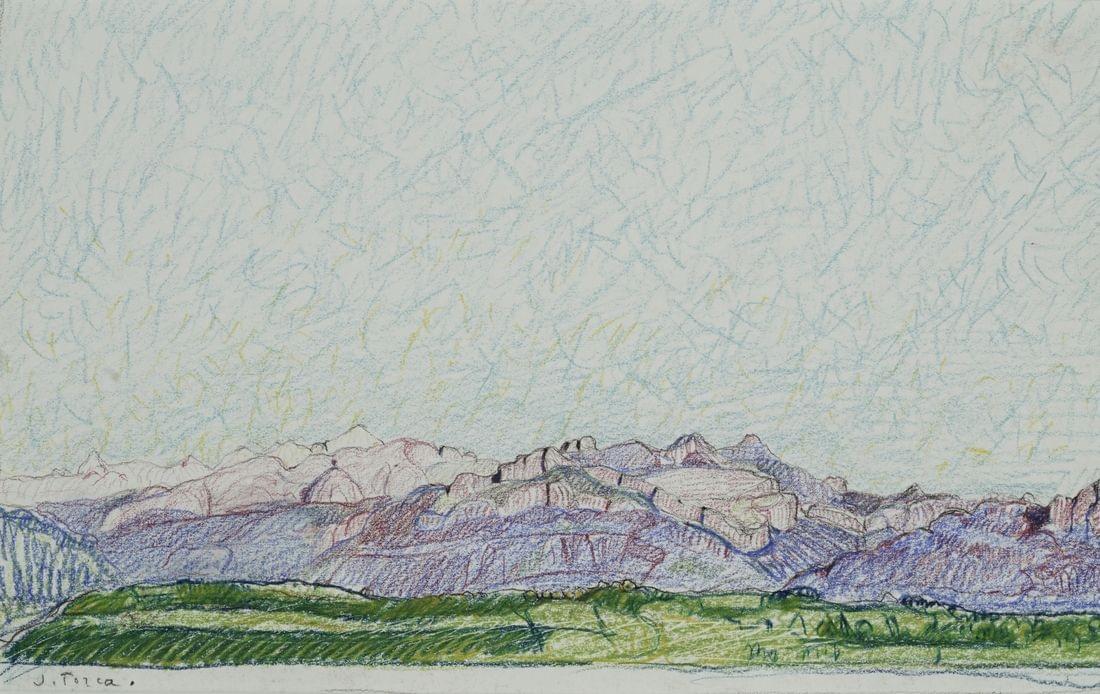 Vue sur les montagnes, crayons de couleurs et craies grasses sur papier, signé, 17x26,5 cm