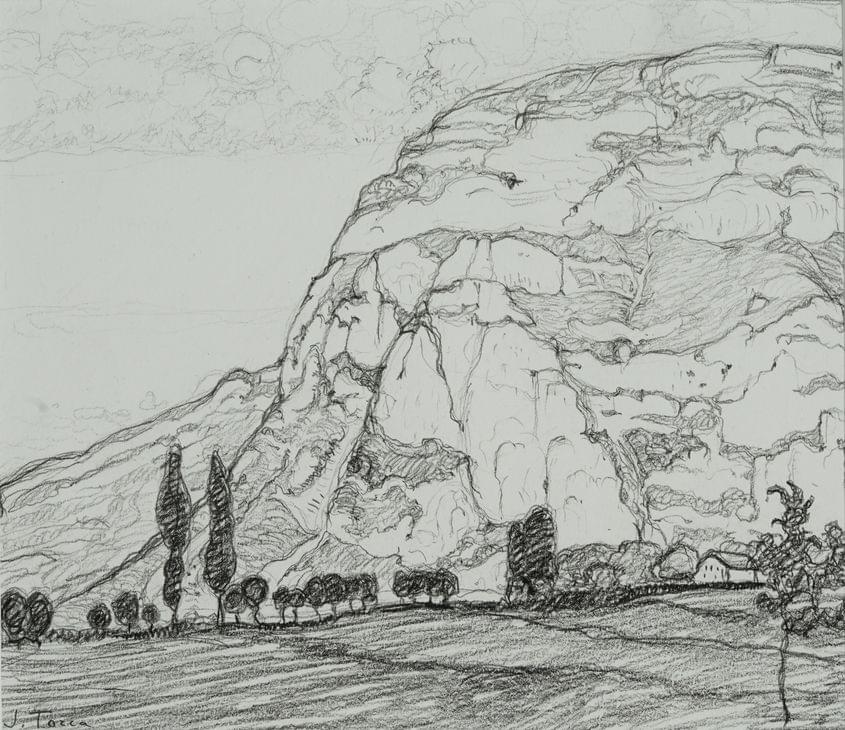 Paysage montagneux, crayon noir sur papier, signé, 17,5x20 cm