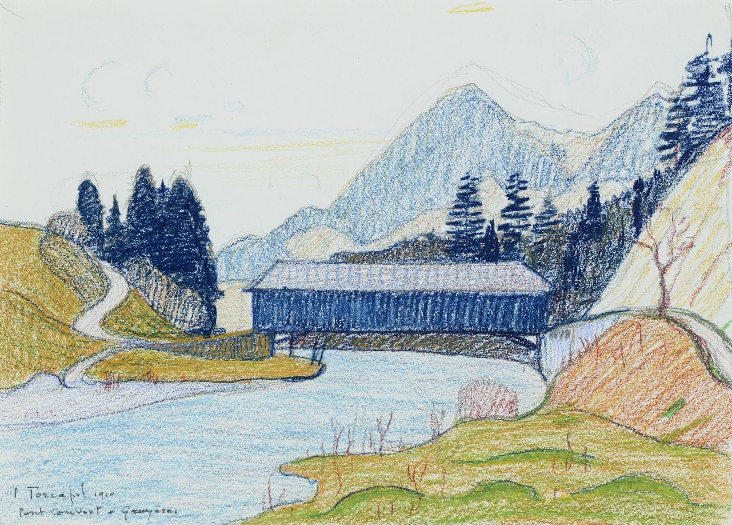 Rue de Gruyères, crayons de couleurs gras sur papier, monogrammé...