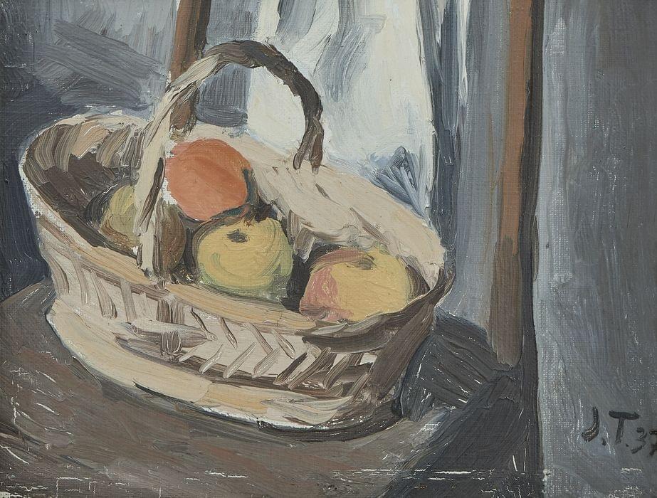 Nature morte au panier de fruits, huile sur toile, monogrammée et datée (19)37, 15,5x20 cm
