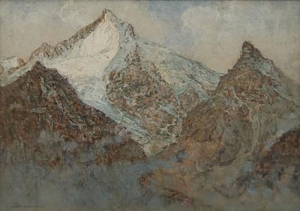Vue de montagnes au coucher du soleil, huile sur carton, signée,...
