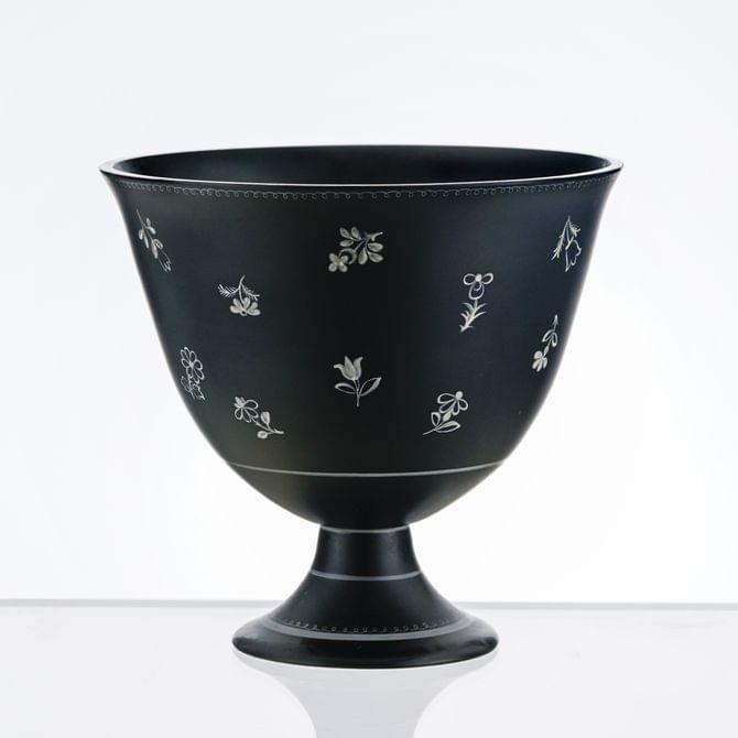 Vase évasé sur talon à motif de semis de fleurs blanches sur verre opaque noir, monogrammé sous la base, H 15 cm