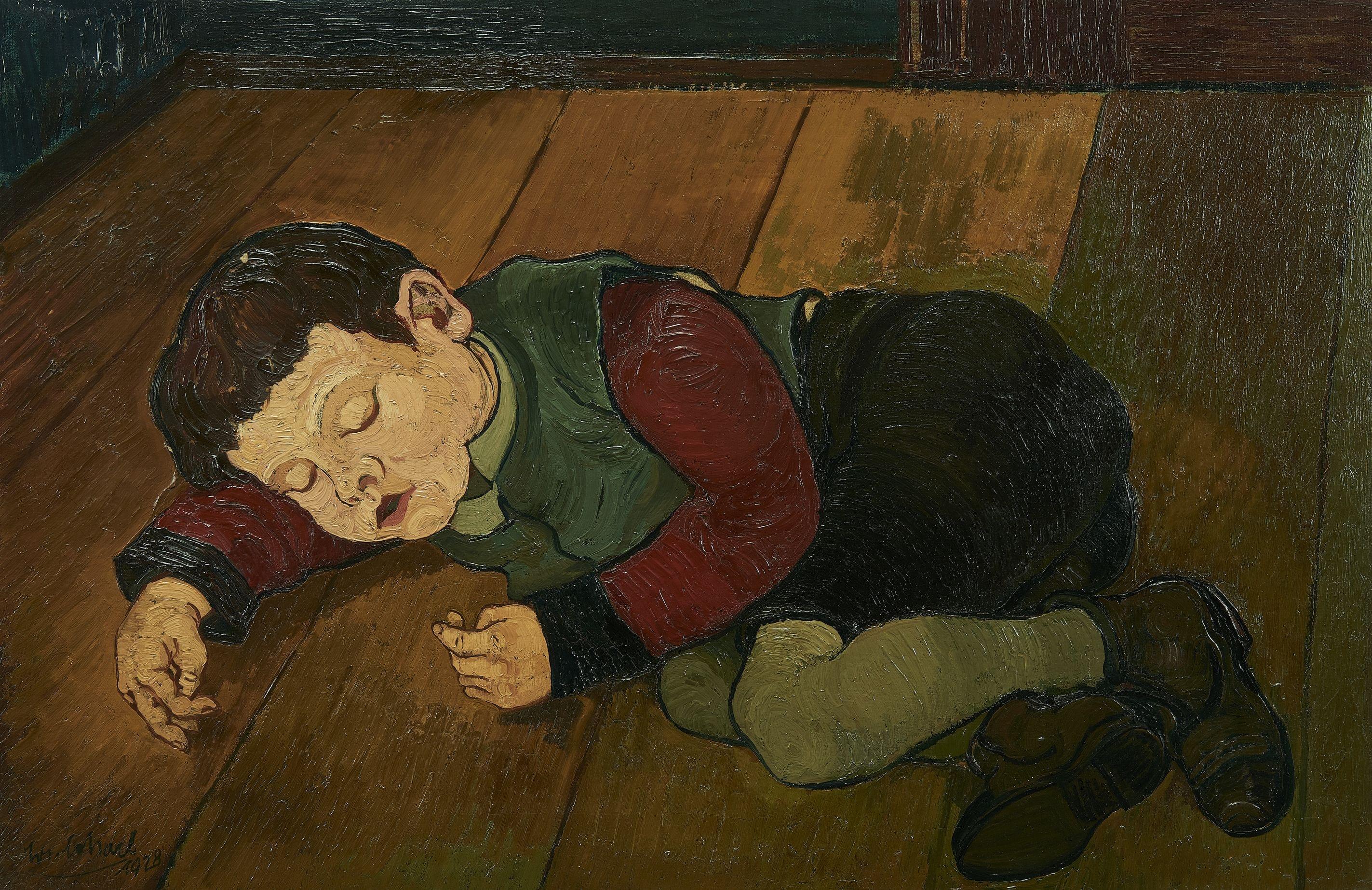 Enfant endormi, huile sur toile, 42x65 cm. Etiquette de la Münchener Neue-Secession signée par l'artiste au dos.