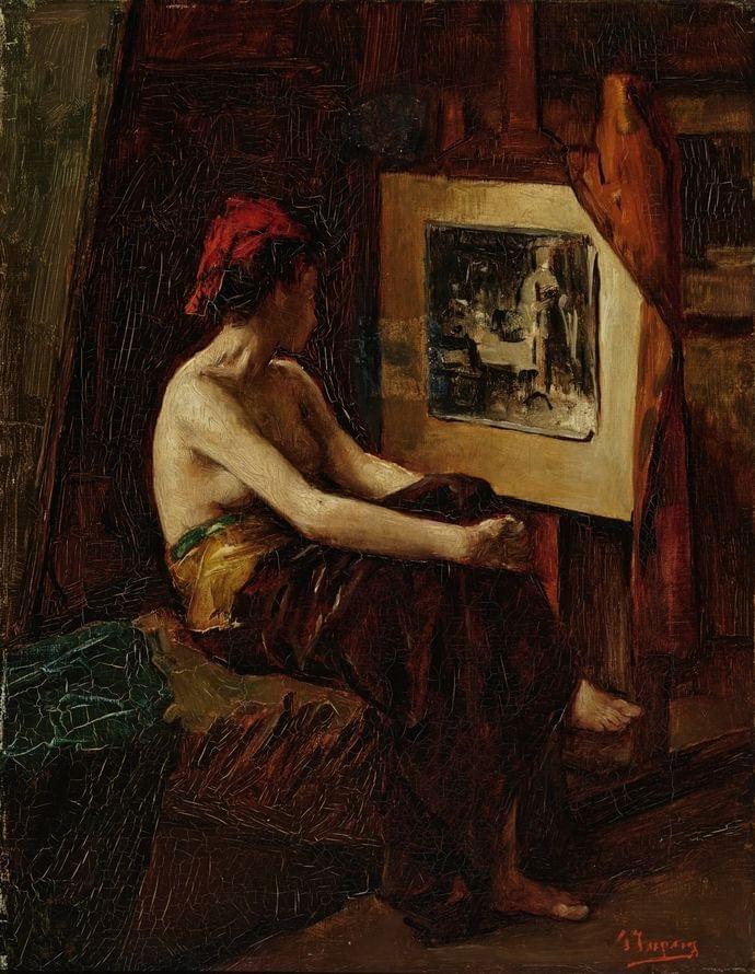 La modèle dans l'atelier, huile sur toile signée, 36x28 cm