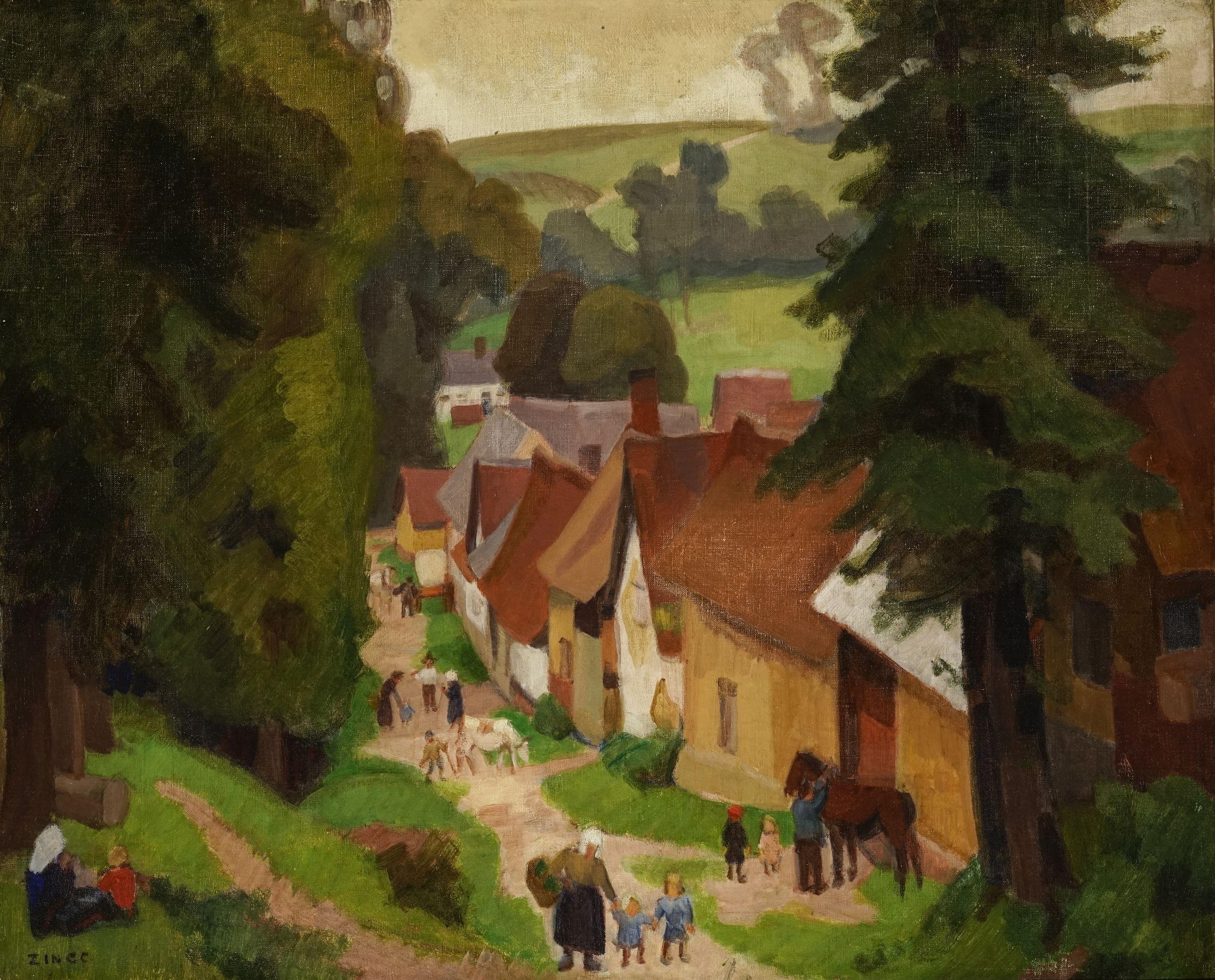 Hameau animé, huile sur toile, signée, 81x100 cm