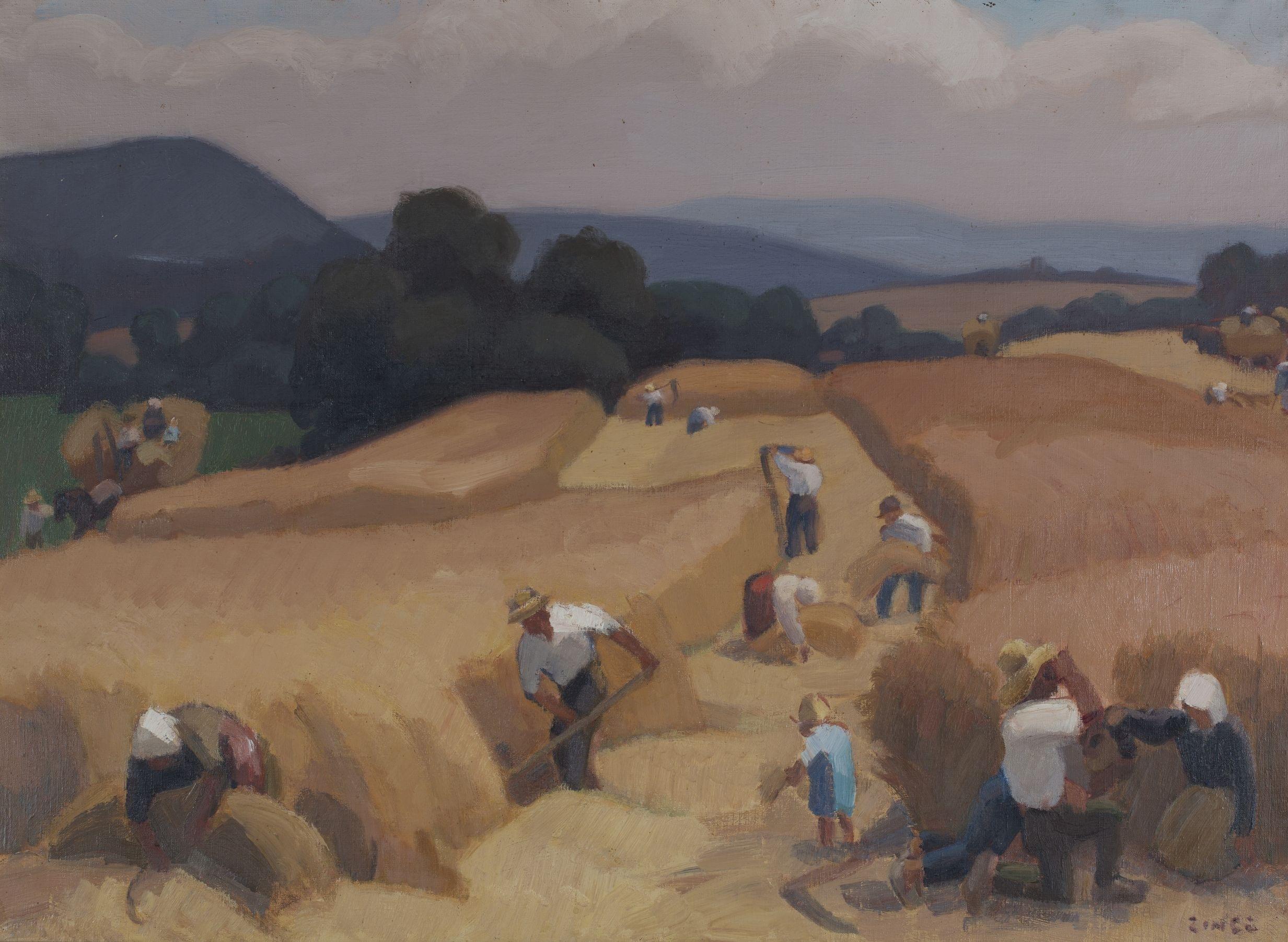 Hameau animé de deux paysans et d'un chien, huile sur toile, 52x...