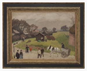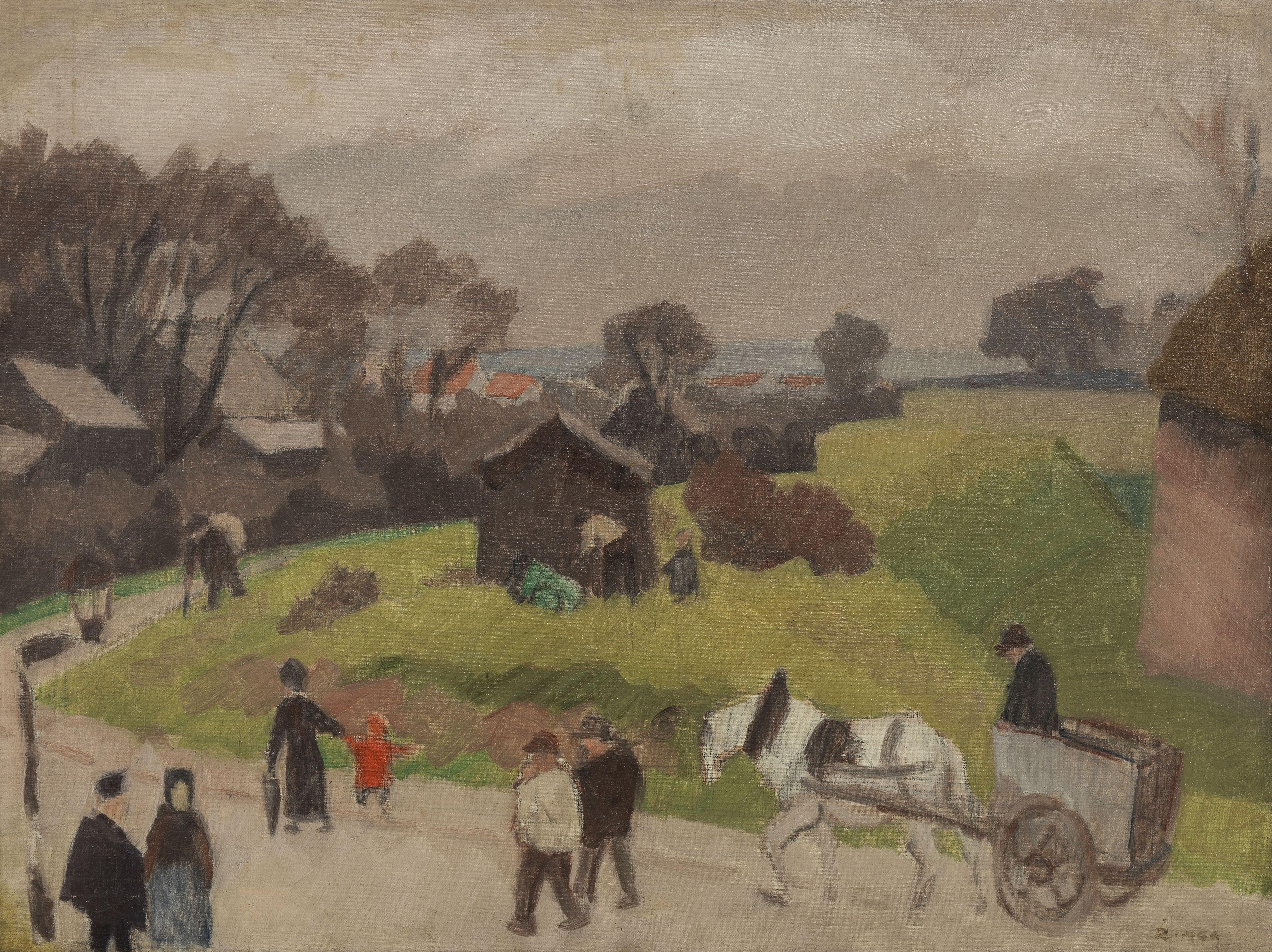 Personnages au bord d'un étang, huile sur panneau, signée, 39x46...