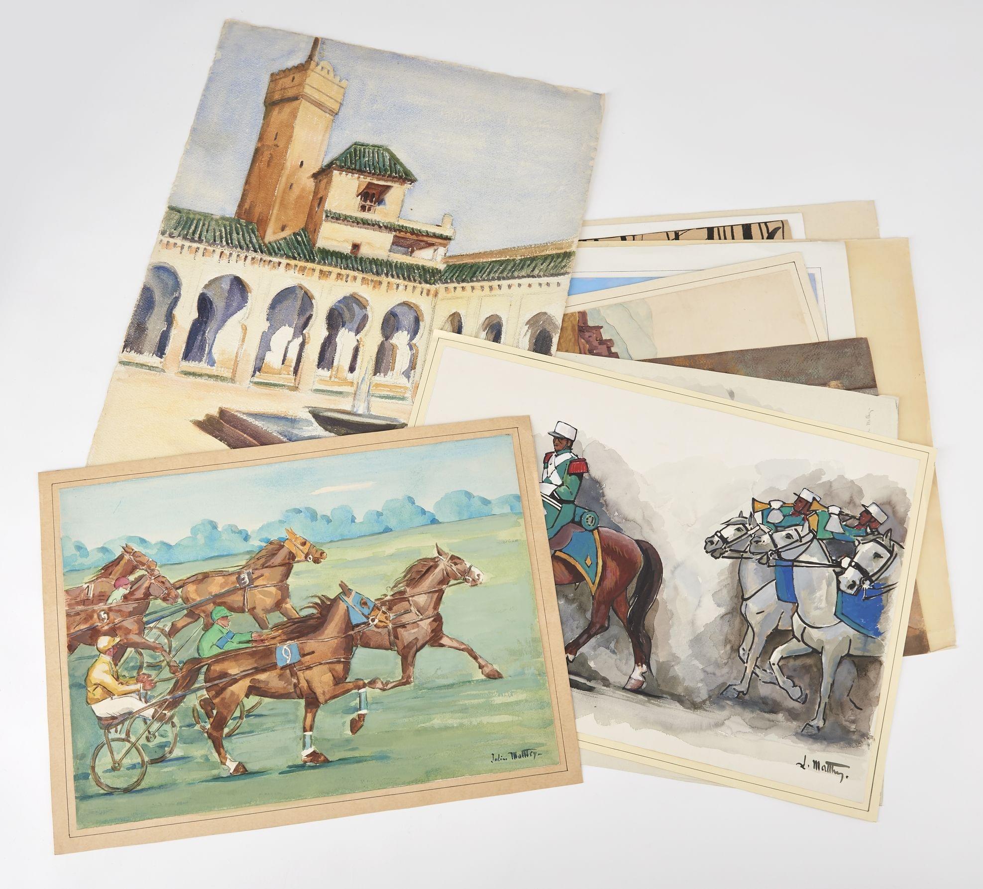 Cartable d'aquarelles de chevaux et vues du Maroc, aquarelle sur papier, de 17x34 à 64x50 cm