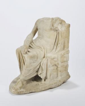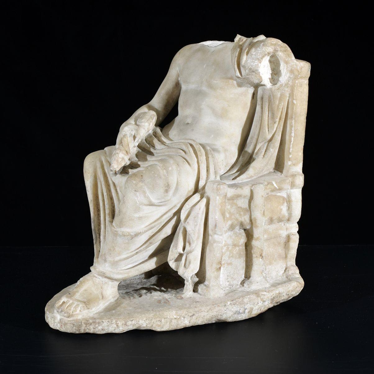 Le dieu représenté assis sur un trône, tient dans sa main droite la foudre, marbre, époque romaine, probablement Asie mineure, Ie s av. J-C, H 33 cm