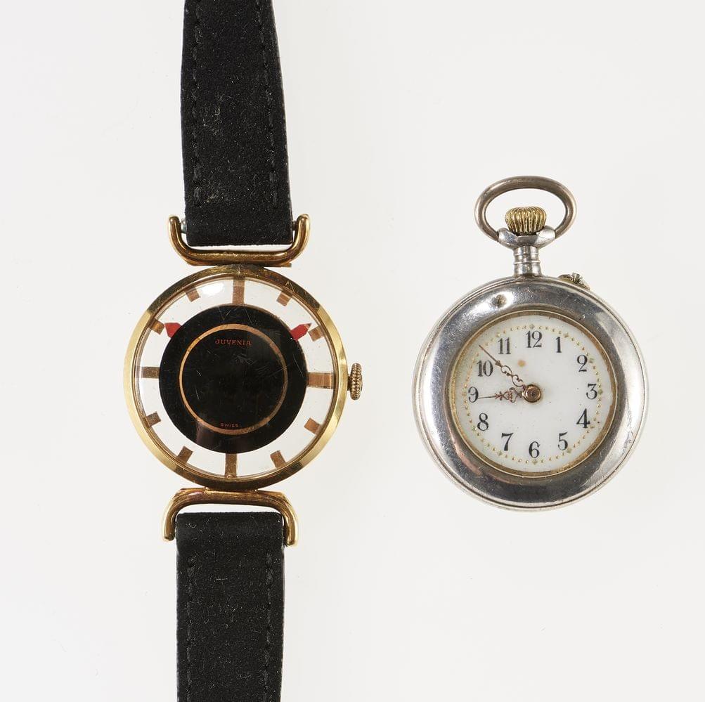 Cadran noir, aiguilles rouges, métal doré, D 27 mm. On joint une montre de poche Art nouveau en argent, D 27 mm.
