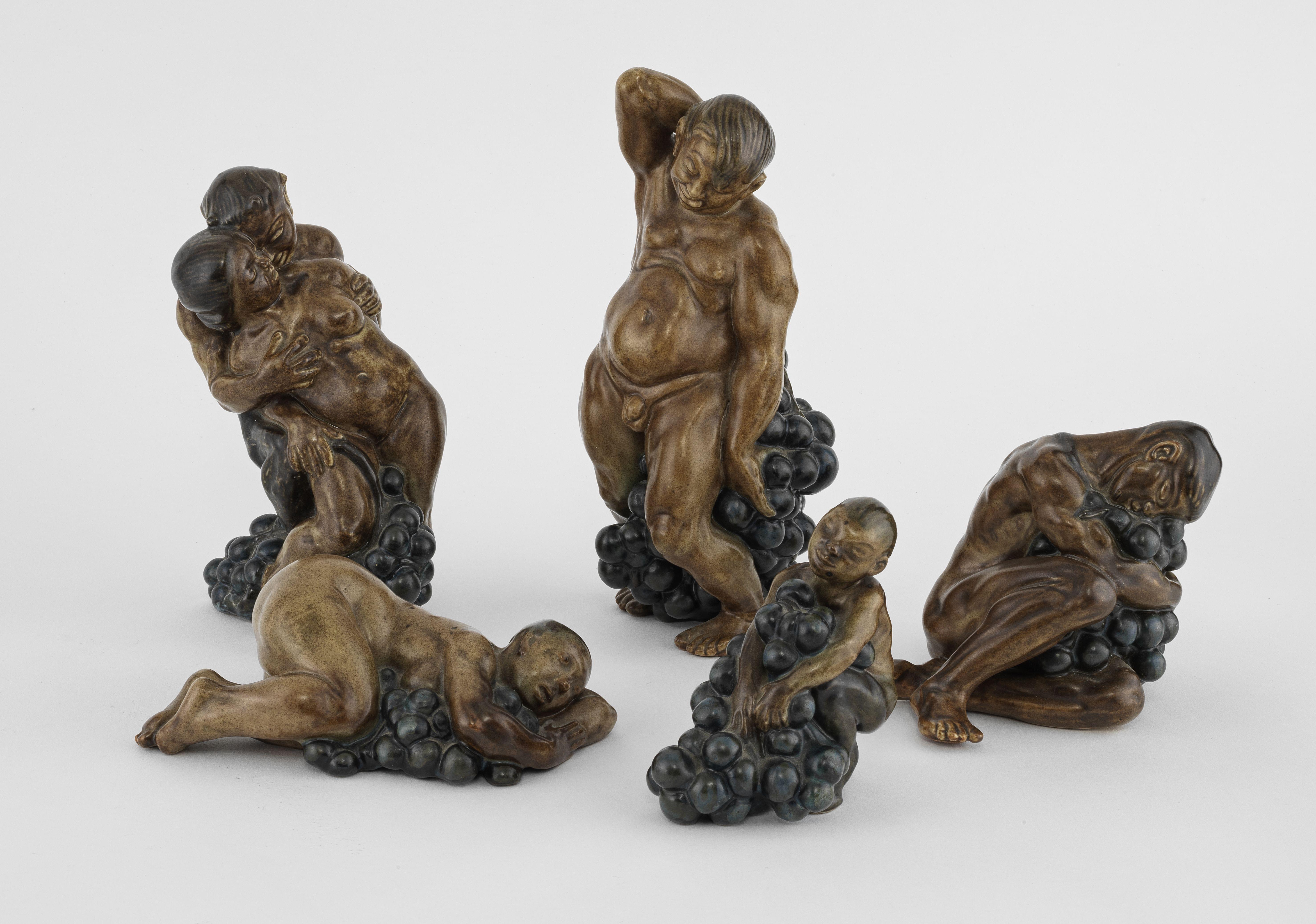 Statuettes figurant des faunes vendengeurs, céramique émaillée, H de 11 à 25 cm
