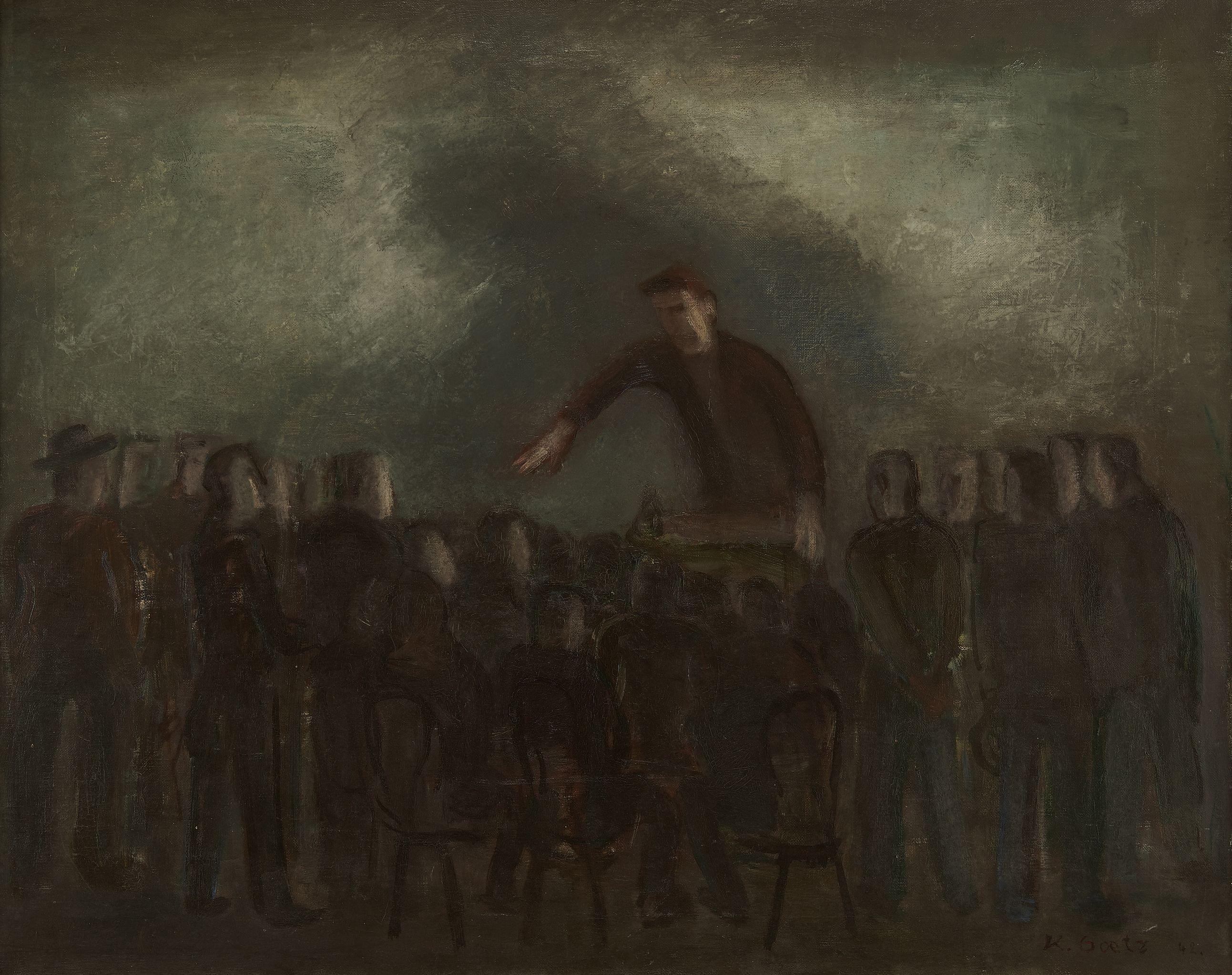 Assemblée politique, huile sur toile, signée et datée 42, 65x82 cm