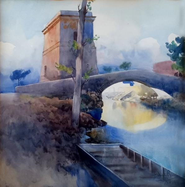 Pont Nomentano, aquarelle sur papier, signée, 55x50 cm
