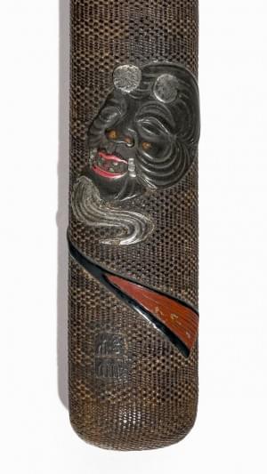 Fibre tressée à décor en laque d'un masque de nô et éventail, signé, L 21 cm