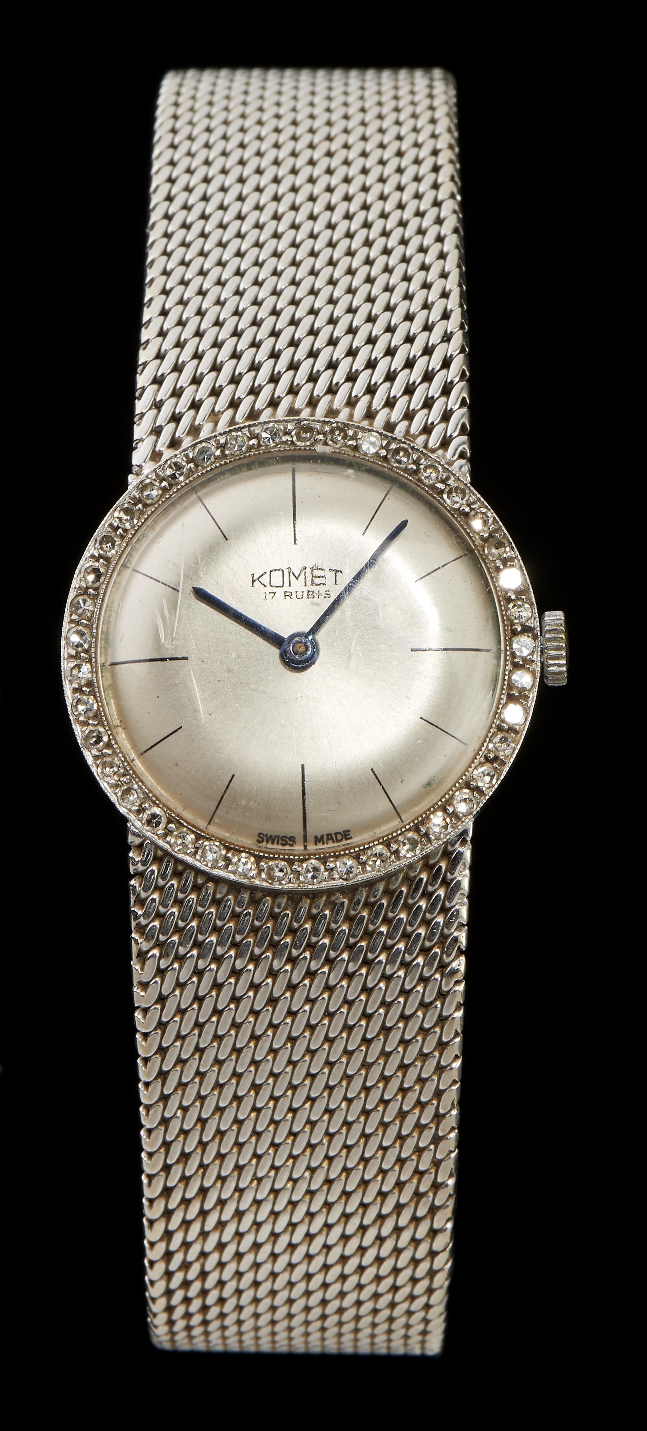 Cadran gris, aiguilles bleues, index bâtons noirs, or gris 750, D 23 mm, L 16,5 ou 17 cm, poids brut 45 g