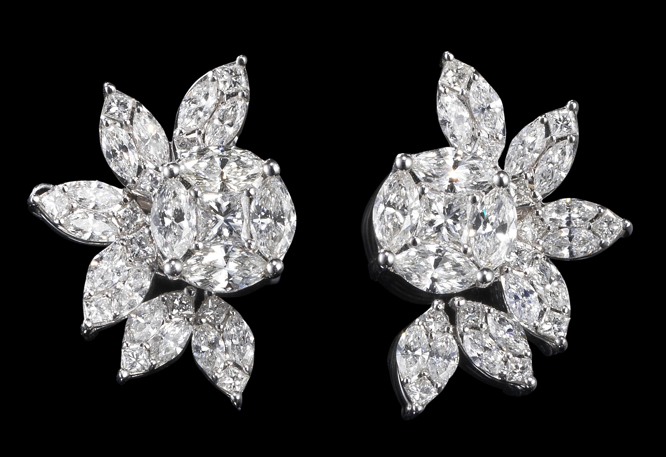 212. Korloff, boucles d'oreilles à motif de demi-fleurs pavées de diamants taille marquise et princesse