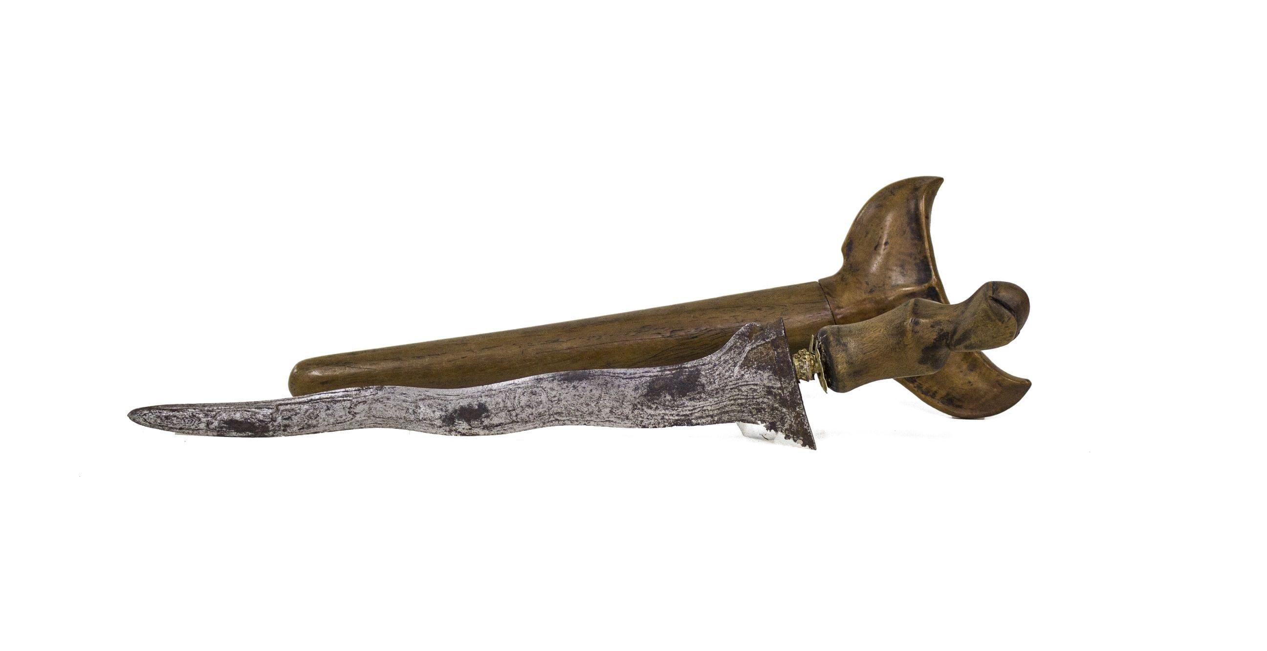 Poignée en bois sculpté et lame flamboyante, L 35 cm
