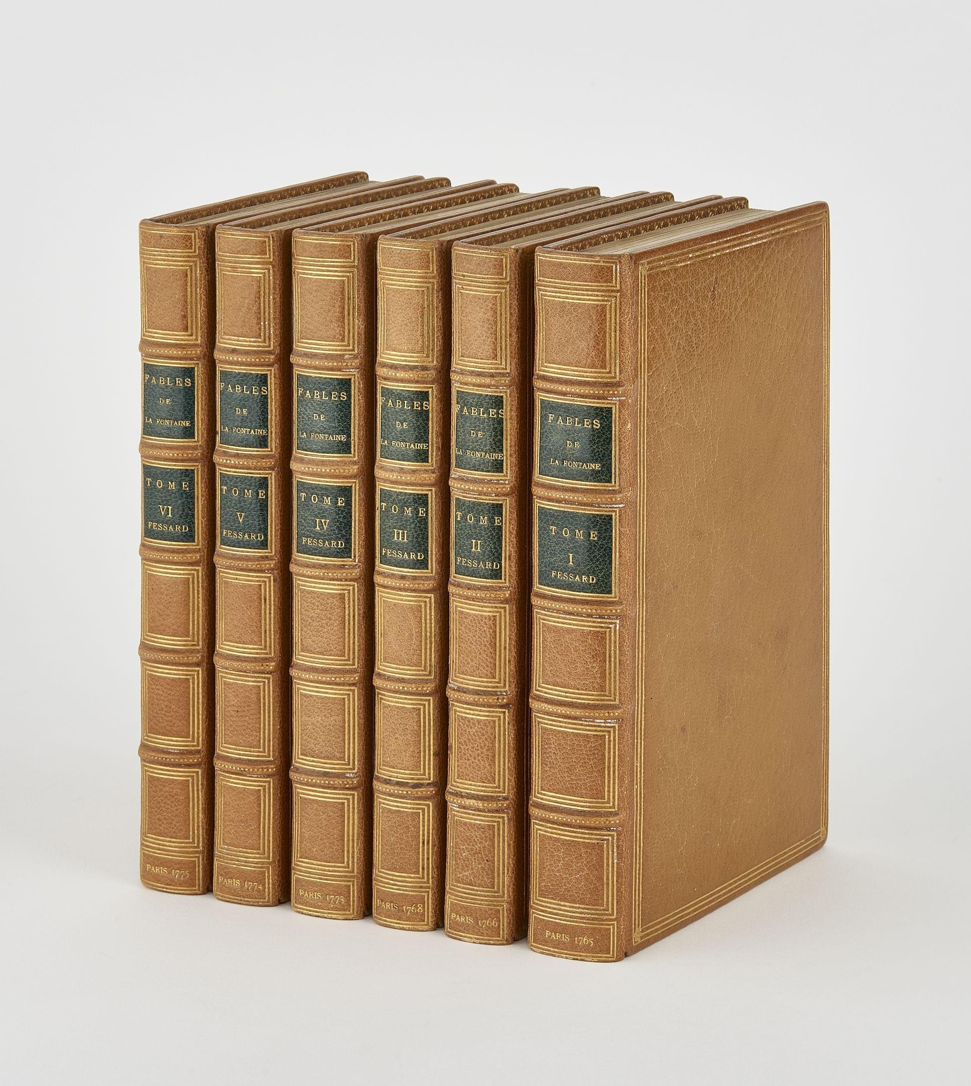 6 vol. in 8, maroquin citron, dos à nerfs ornés, triple filet sur les plats, dent. int, tr. dorées sur marbrure. Reliure de PAGNANT. Figures gravées par Fessard, le texte par Montulay.
