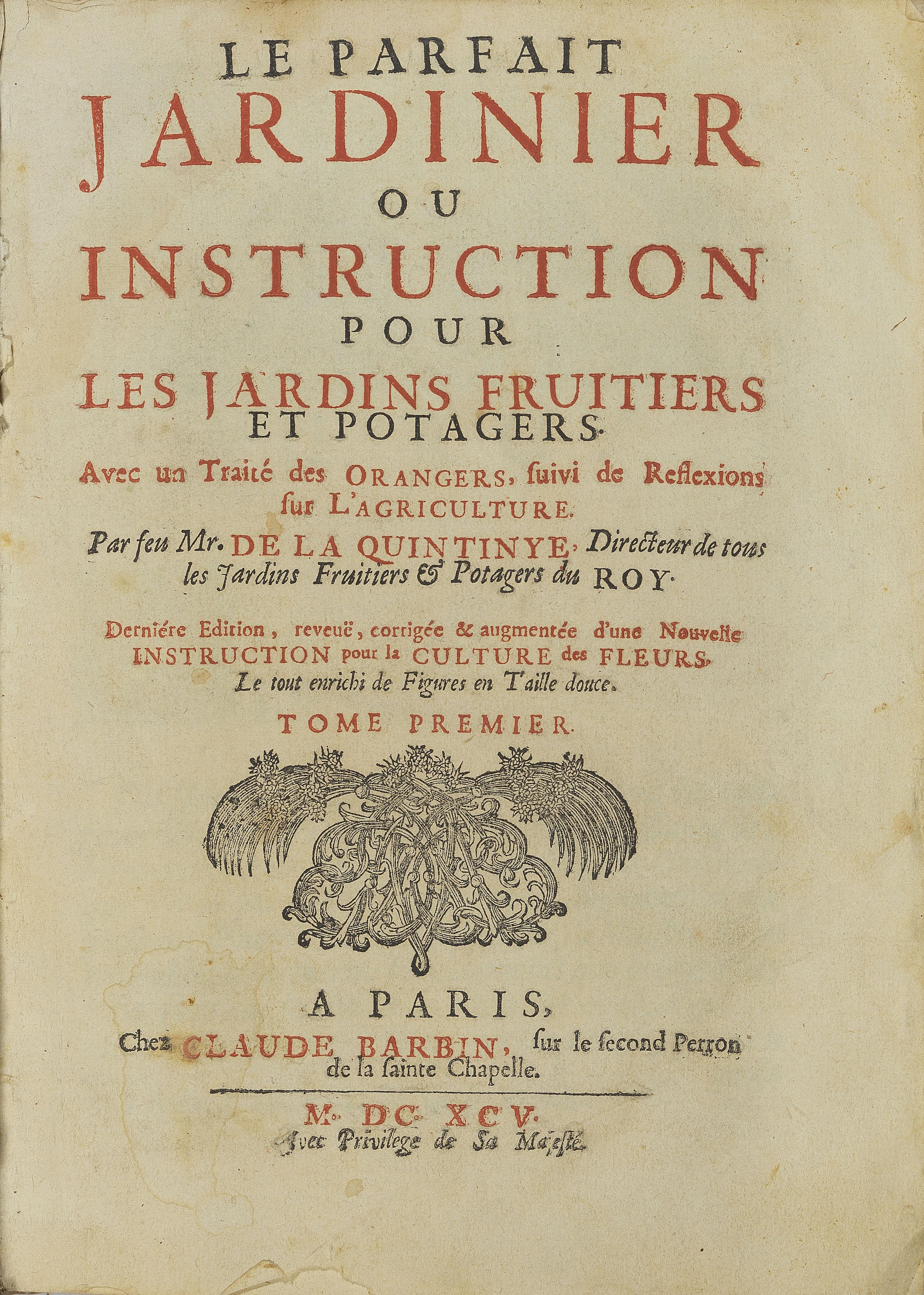 4395. LA QUINTINYE (Jean-Baptiste) : Le Parfait Jardinier ou Instruction pour les jardins fruitiers et potagers...Paris, Barbin, 1695