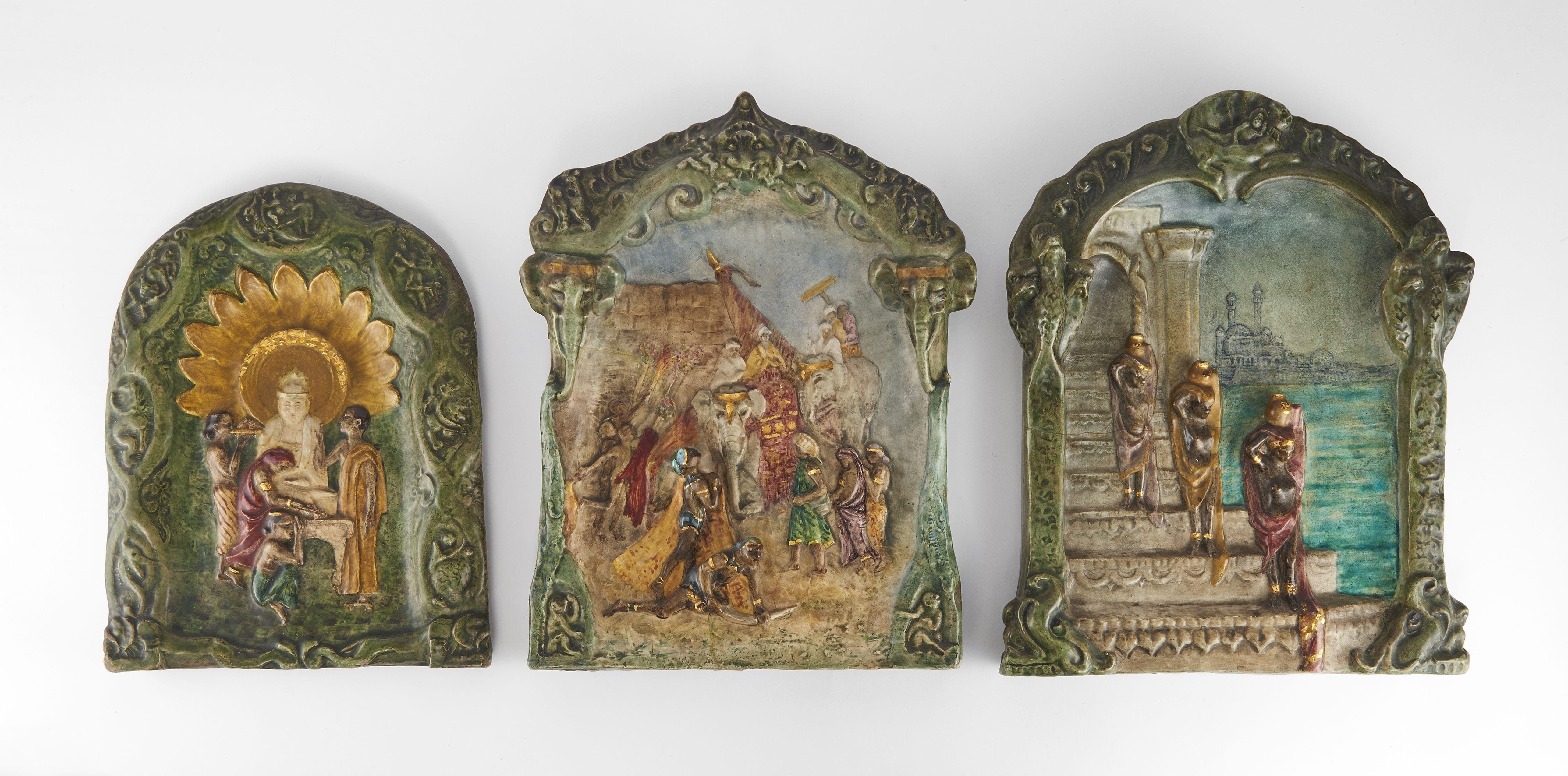 Vues orientalistes, trois plaques en bas-relief, céramique émaillée polychrome, H 43 cm