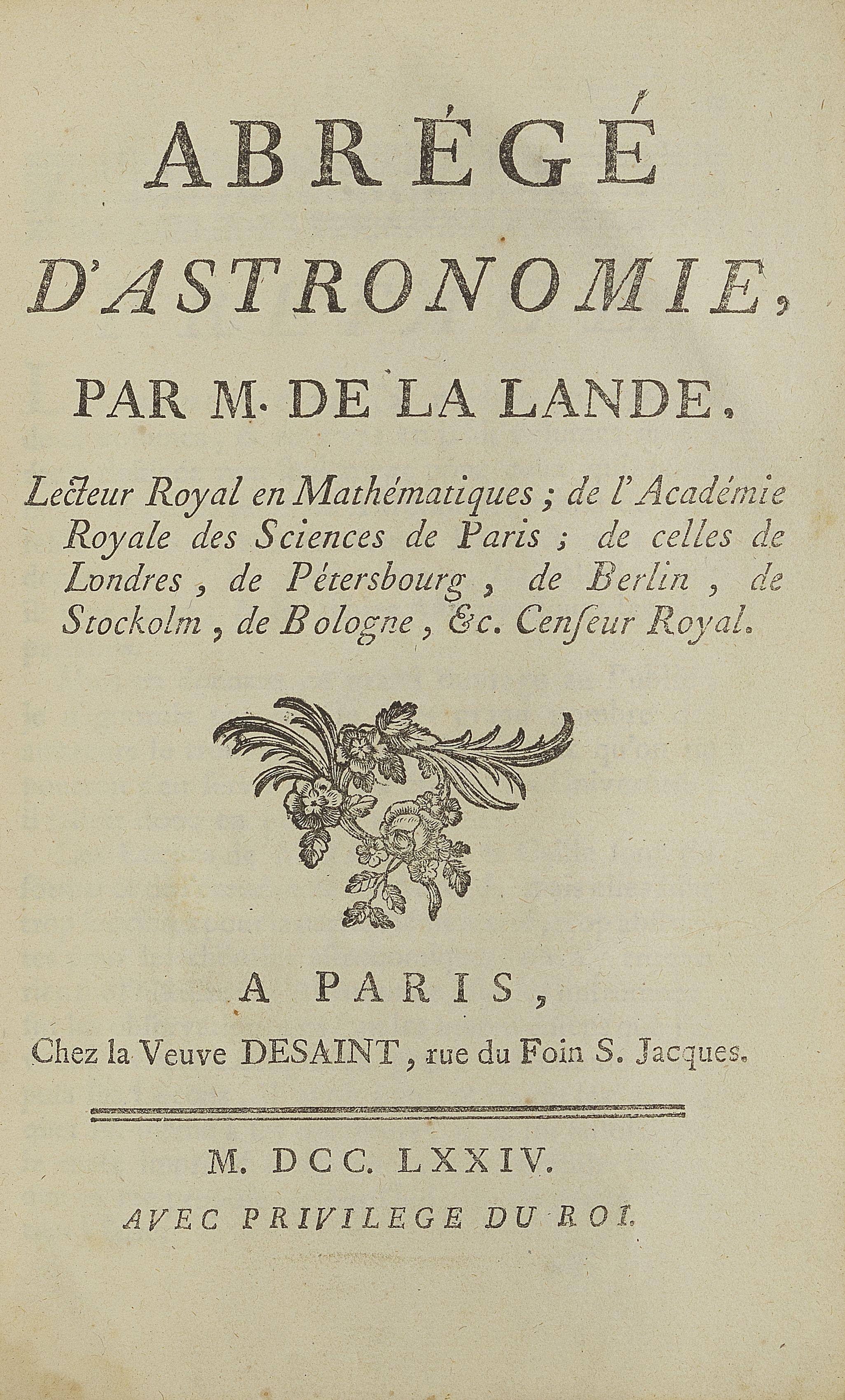 30. LALANDE (Joseph-Jérôme Lefrançois de) : Abrégé d'astronomie. Paris, Veuve Desaint, 1774
