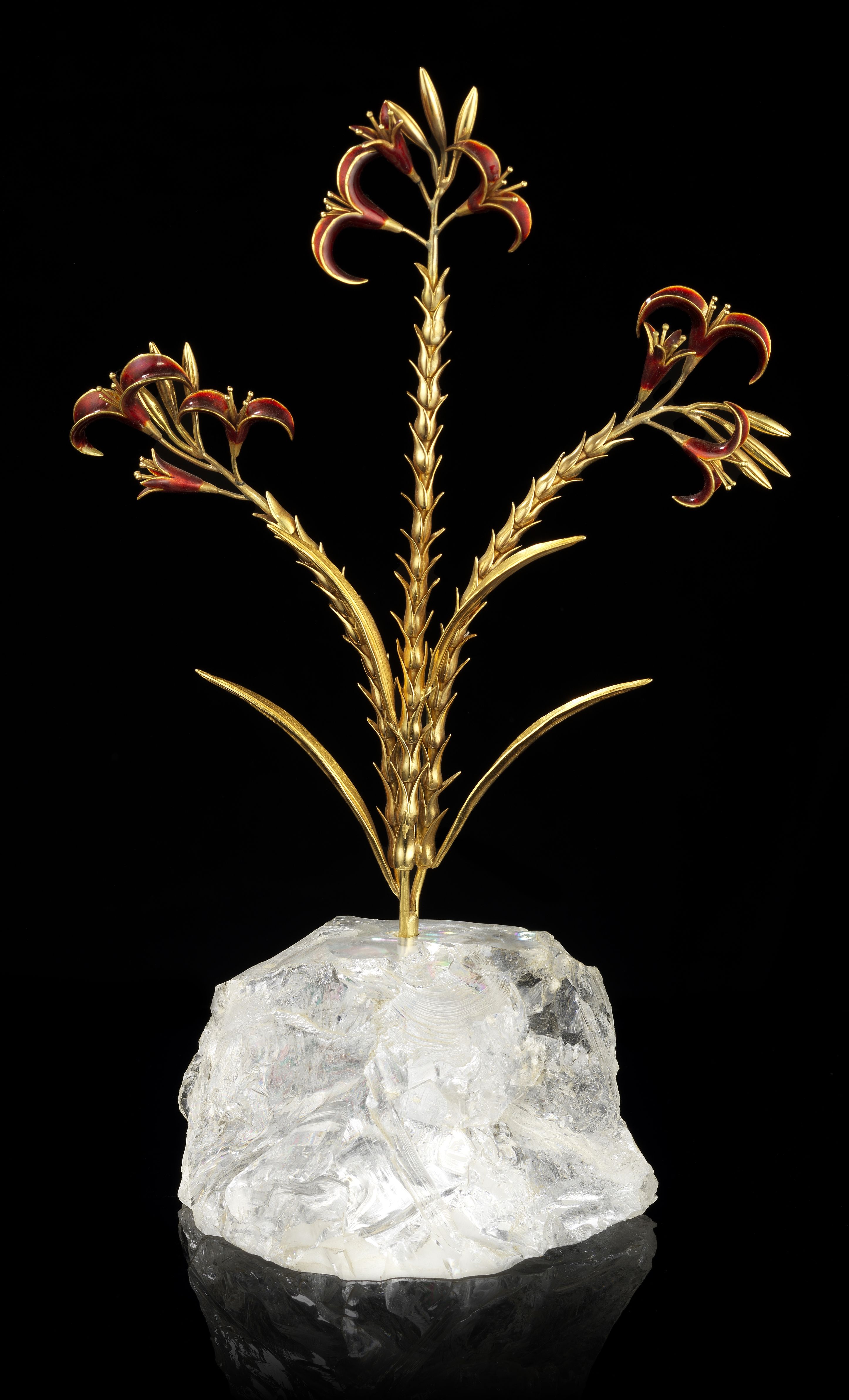 Grèce, or 750, émail rouge, cristal de roche, H 20 cm, la tige 1...