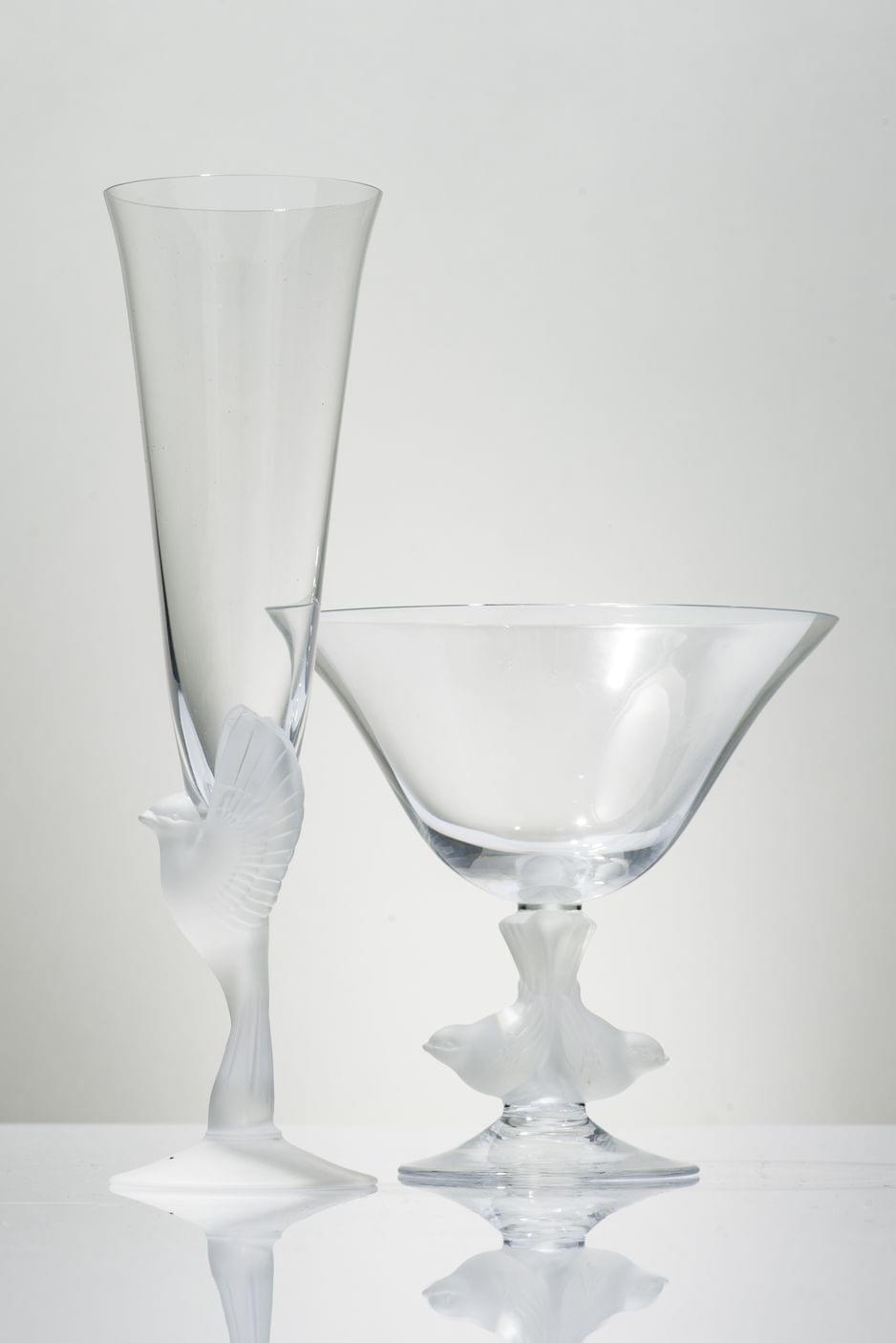 549. Lalique (dans le goût de), 24 coupes et 12 flûtes à décor de colombes