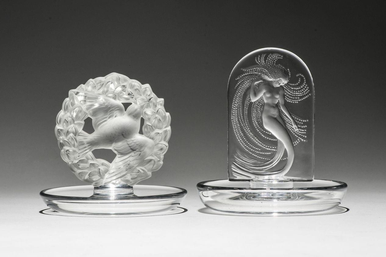 Verre blanc moulé-pressé patiné, signés, H 5 cm