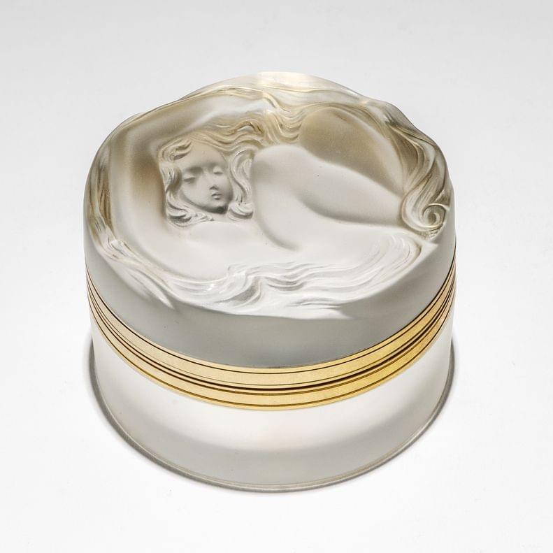 Petite bonbonnière, verre blanc moulé-pressé, monture en laiton, signée, D 8 cm
