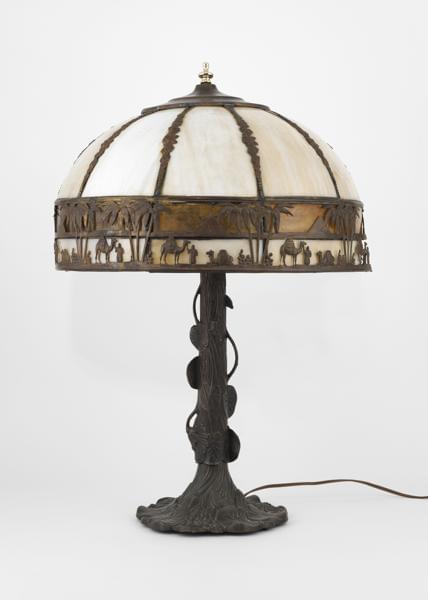 Métal repoussé à motif de nénuphars, abat-jour en vitrail à décor d'oasis et pyramides, H 67 et D 43 cm