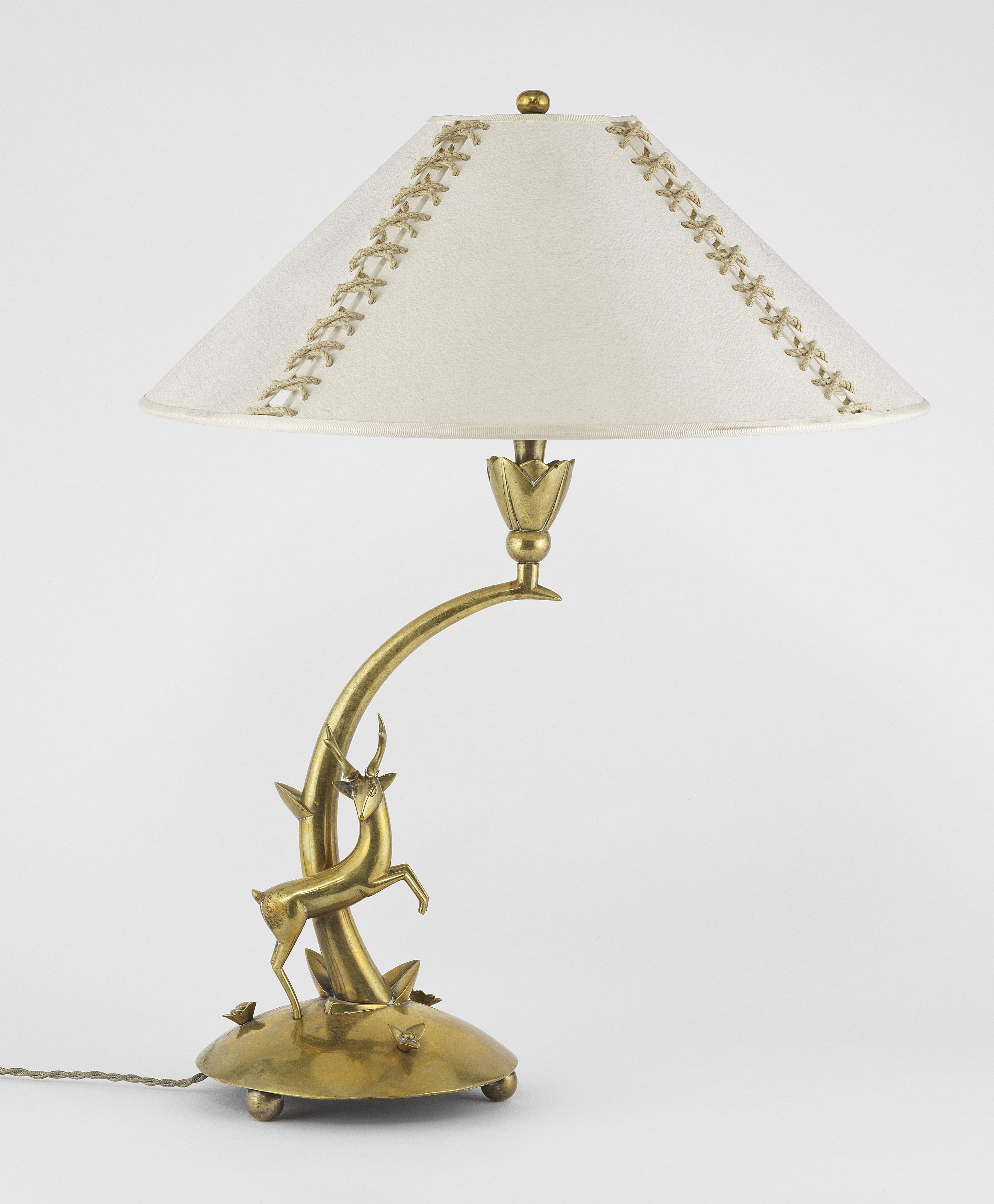 Laiton, pied à décor d'un cerf en ronde bosse, H 60 cm. Provenance: collection baronne Marion Lambert