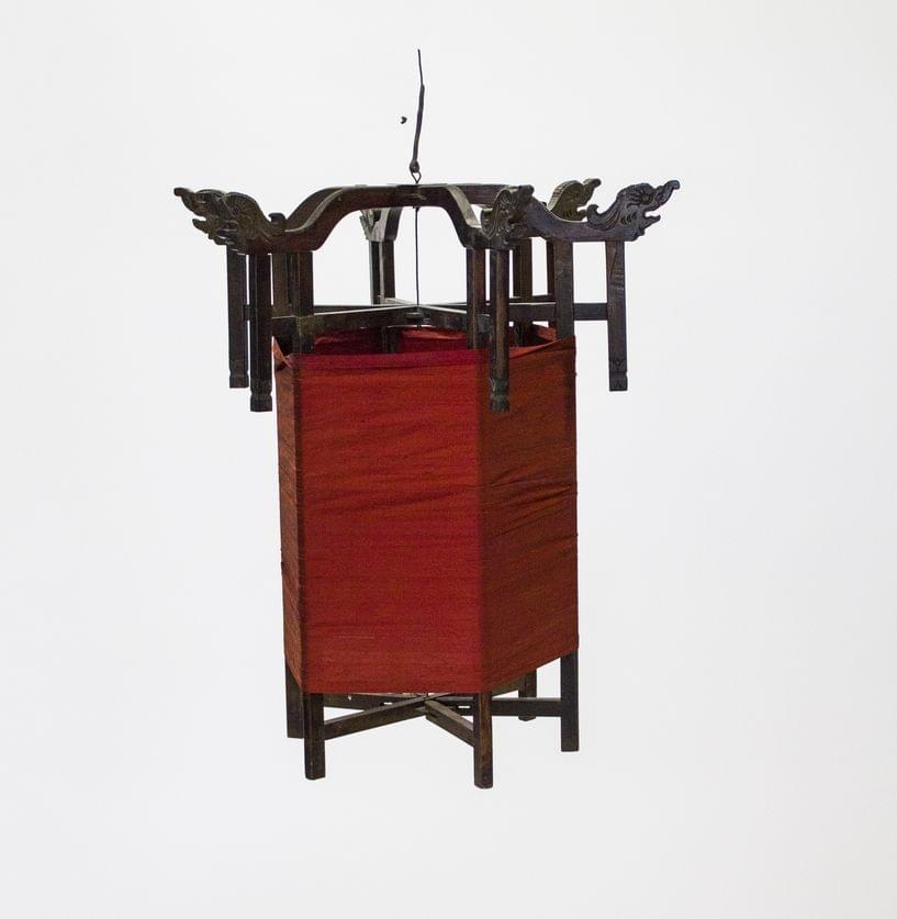 Montants amovibles, bois sculpté de têtes de dragons, tissu rouge, Chine, Xxe s, H 60 cm