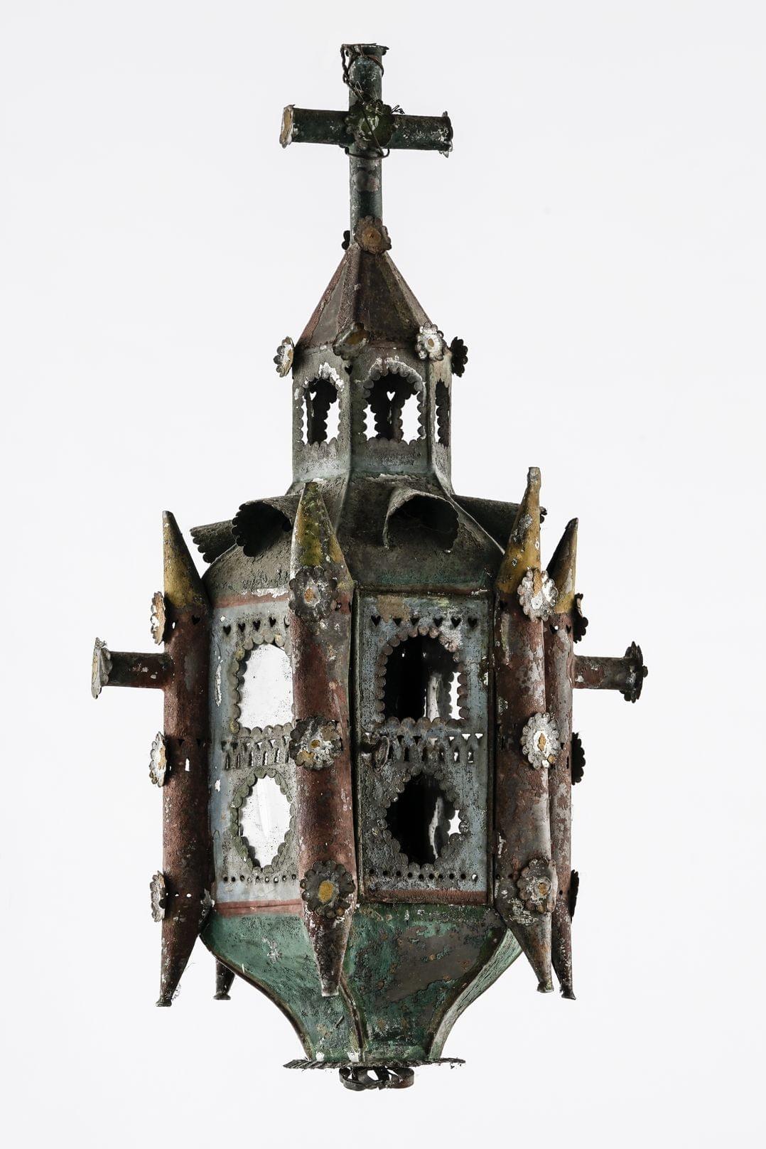 Tôle peinte, découpée et ajourée, sumontée d'une croix, H 64 cm. Provenance: Château fribourgeois