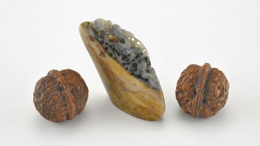 Sculptés de personnages et d'un dragon noix et pierre dure, H 7...