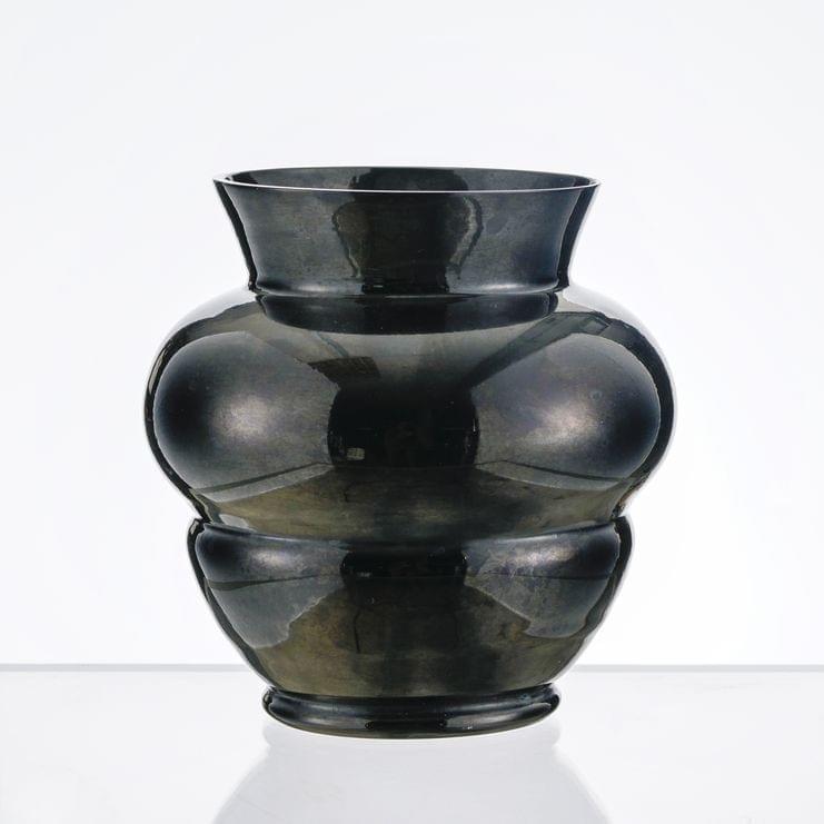 Vase à panse renflée, verre vert à patine argentée craquelée, H...