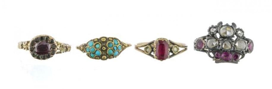 3127. Lot de quatre bagues anciennes serties de turquoises, grenat, ve...