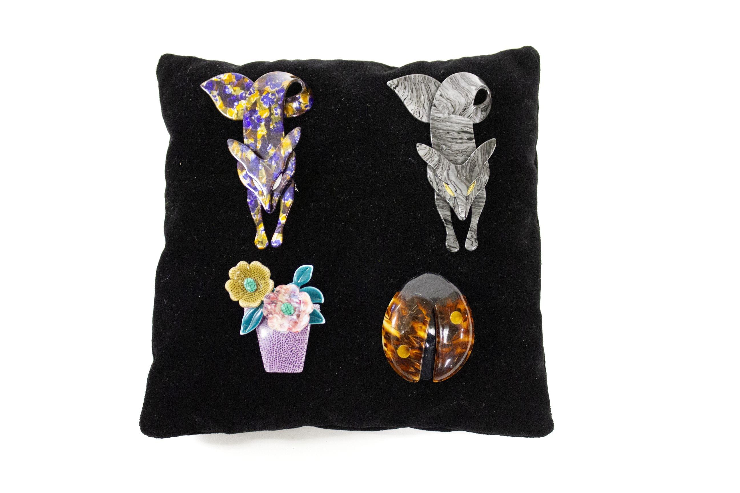 3192. Lea Stein, lot de quatre broches à motif de deux renards, une coccinelle et un bouquet de fleurs